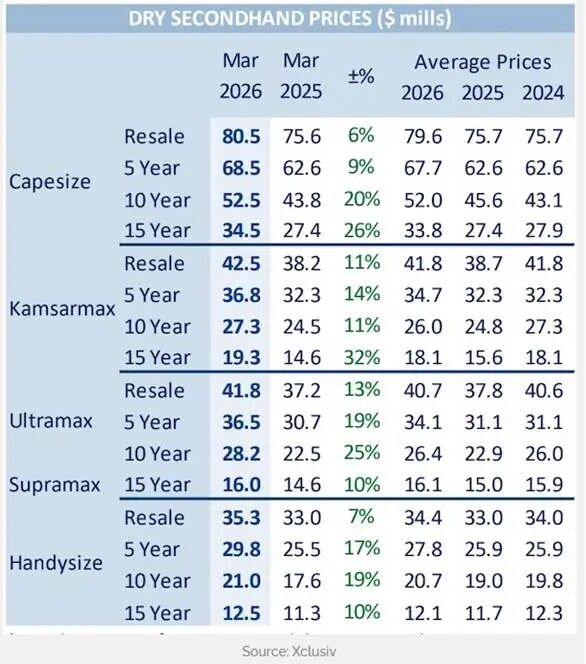过去一周,活跃于二手船市场的船东聚焦于干散货船及苏伊士型油轮。船舶经纪公司Xclusiv在其最新周报中指出,干散货船交易涵盖多种船型,新船型及新造船转售表现突出。超巴拿马型/卡姆萨尔型船板块,常石舟山造船2010年建造的9.3万载重吨COPERNICUS N轮以1235万美元的价格成交;中船天津2022年建造的8.5万载重吨现代型GIA INSPIRATION轮则以3330万美元的价格售出。今治造船2016年建造的8.3万载重吨MG MERCURY轮由远东买家以2850万美元的价格购入;常石舟山造船2013年建造的8.2万载重吨LOCH LONG轮以2300万美元的价格售予希腊买家。巴拿马型船板块,希腊买家以2600万美元的低价收购佐世保2015年建造的7.8万载重吨BARWON轮。极灵便型船板块,江苏韩通船舶2014年建造的6.4万载重吨JIN RUI轮以2400万美元的价格售予华亚海运关联客户;厦船重工2012年建造的5.7万载重吨超灵便型II类船HONY FUTURE轮以1400万美元的低价易手。此外,常石舟山造船2010年建造的5.8万载重吨XO COPENHAGEN轮以1630万美元的价格售予中国买家;澄西造船2011年建造的5.3万载重吨FIGEAC轮以1300万美元的价格成交;青山船厂2010年建造的5.7万载重吨PAPA JOHN轮则以1300万美元的中高位价格售出。灵便型船板块,江苏大津2027年建造的3艘4万载重吨OHBS姐妹船JIANGSU DAJIN DJHC6404、DJHC6405及DJHC6406轮以9000万美元的打包价成交。