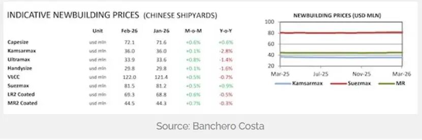 船舶经纪公司Banchero Costa在另一份周报中指出,新造船市场持续活跃。油轮板块,中国恒力重工获得希腊船东Dynacom 4艘VLCC订单,预计交付期从2029年底开始,至2030年第二季度完成。至此,Dynacom在该船厂的订单量已达16艘(其VLCC船队总数将超过60艘)。希腊船东Chandris在上海外高桥造船确认2艘苏伊士型油轮订单,以推进船队升级,预计交付期为2028年中至年底。集装箱船板块,台湾阳明海运计划在某未公开船厂签约订造6艘1.3万TEU集装箱船,单船造价约2.1亿美元。韩国现代商船向现代重工订购10艘2800 TEU集装箱船,总价5.57亿美元,预计交付期从2028年第一季度开始,至2031年第四季度完成。中国黄海造船从Euroseas公司获得2艘2800 TEU集装箱船订单,单船造价4635万美元。