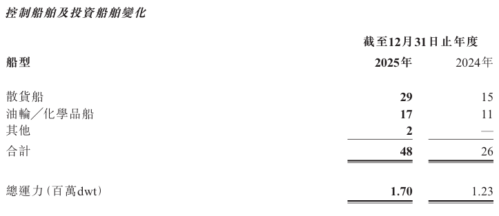 截至2025年12月31日,洲际船务控制船舶共36艘,并通过合营公司投资船舶12艘,其中包括29艘散货船,17艘油轮╱化学品船及2艘船员交通船,综合运力达170万载重吨,较2024年底的123万载重吨同比增长38.21%。平均船龄由2024年的6.0年进一步降至3.6年,船队年轻化优势显著。