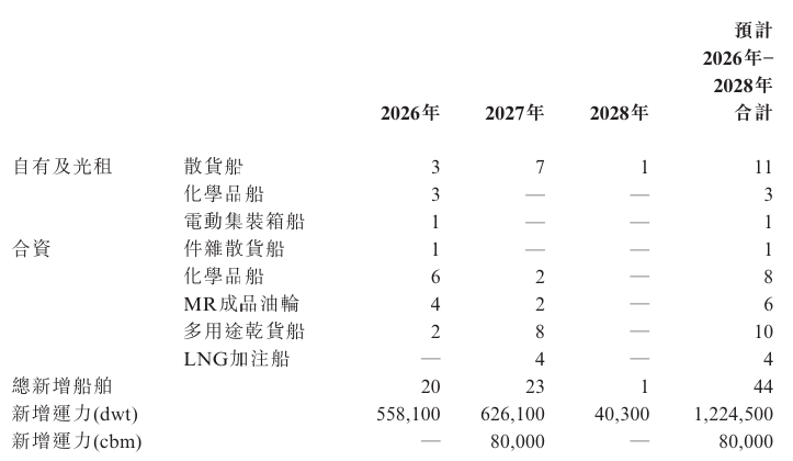 预计2026年至2028年,洲际船务自有及光租的在建船舶为15艘,通过合营公司持有的船舶为29艘,合计44艘,涵盖散货船、化学品船、MR成品油轮、LNG加注船及电动集装箱船等多种船型,总新增运力约122.45万载重吨。