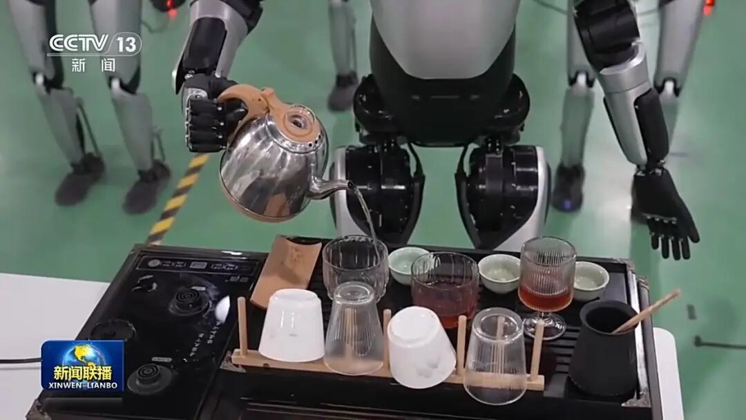 总台央视记者 王世玉:现在这些机器人正在进行出厂前的最后测试,那这台机器人正在练习泡茶。我们看到机器人能精准地找到茶杯的位置,茶水量也是不多不少刚刚好。