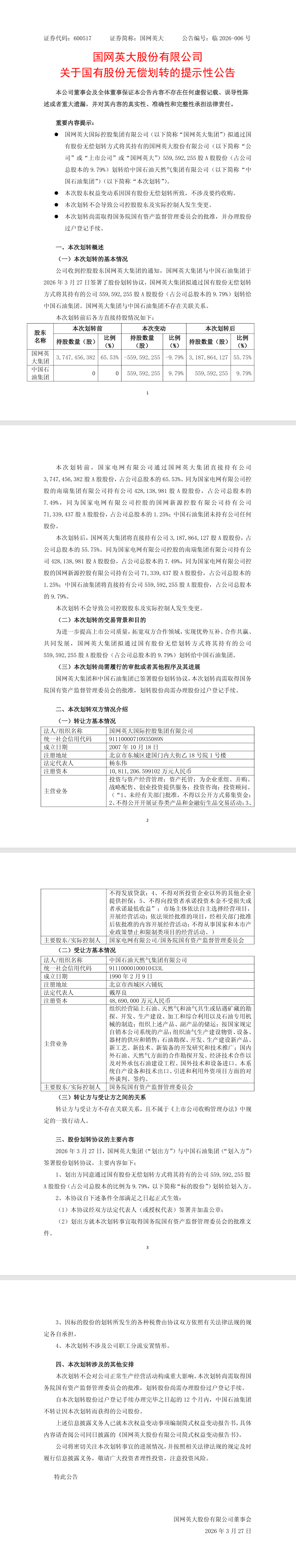 公告表示,本次划转的交易背景和目的为进一步提高上市公司质量,拓宽双方合作领域,实现优势互补、合作共赢、共同发展。本次划转不会对公司正常生产经营活动构成重大影响。国网英大集团和中国石油集团已签署股份划转协议,本次划转尚需取得国务院国有资产监督管理委员会的批准,划转股份尚需办理股份过户登记手续。