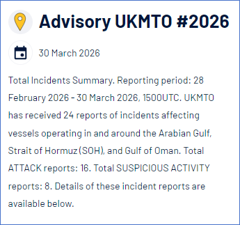 英国海上贸易行动办公室当地时间3月30日发布安全通告称,在2月28日至3月30日15时(协调世界时)的统计周期内,该机构共收到24起涉及船只安全的事件报告。相关事件主要发生在波斯湾、霍尔木兹海峡以及阿曼湾海域。