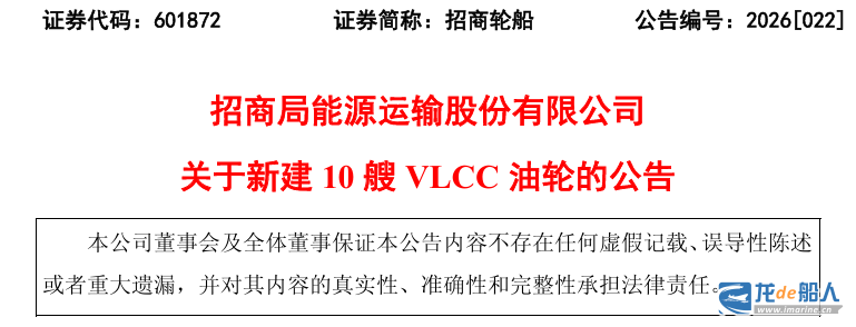 招商轮船表示,该公司于2026年3月25日召开的第七届董事会第二十七次会议审议通过了《关于新建VLCC油轮的议案》,董事会同意公司在中国船舶工业股份有限公司(中国船舶)旗下一线船厂新建10艘VLCC。