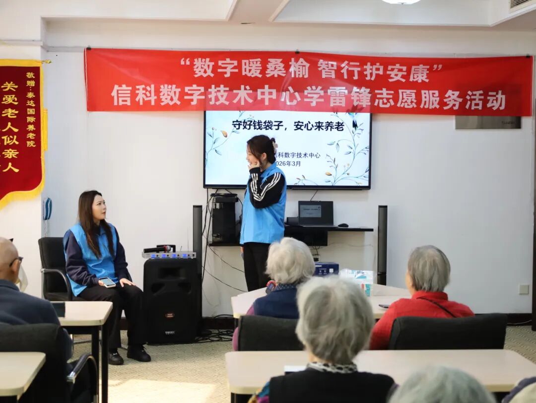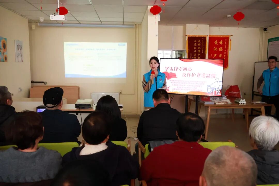 信科公司数字技术中心“蔚蓝力量”青年志愿者走进泰达国际养老院,开展为老人演示防毒面具佩戴方式、用情景剧形式演绎生动案例揭秘诈骗套路、教老人使用手机人工智能应用等志愿服务活动。