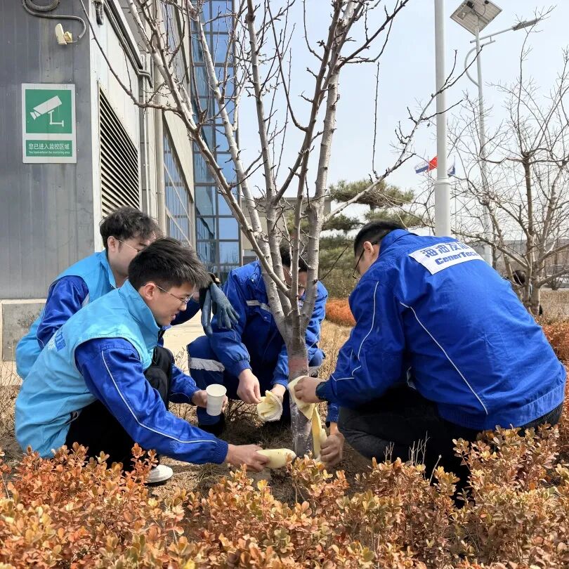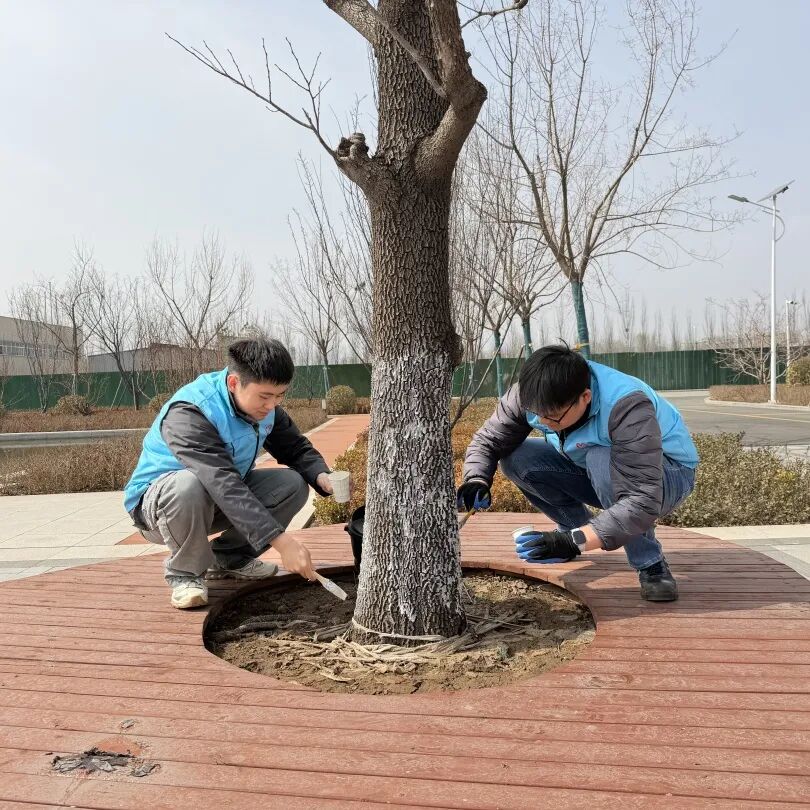 贵金属公司 “蔚蓝力量” 青年志愿者为园区树木集中涂白春防。志愿者为树木穿上防护 “新衣”,可杀灭越冬病菌虫卵、预防日灼与病害滋生,助力树木健康生长,美化园区环境。