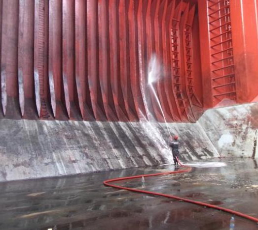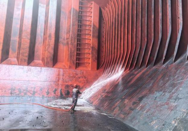 煤改粮备舱工作难度大、要求高,货舱内煤渍、粉尘等残留物遍布,任何疏忽都可能导致验舱失利。全体船员以高度的责任意识投入工作,将精益求精落实到每一个细节。冲洗作为备舱核心环节,船员们紧握高压水枪,先以海水全面冲刷舱壁,对高处区域全力攻坚,再用淡水对肋骨背面、管路等隐蔽部位反复冲洗,与时间赛跑,汗水浸透工装仍毫不动摇。
