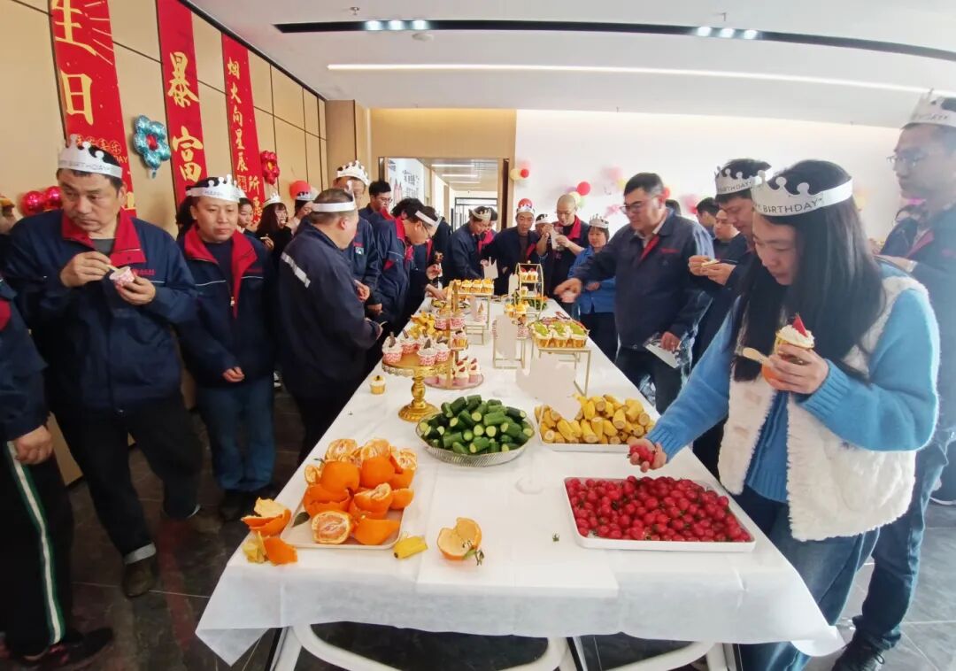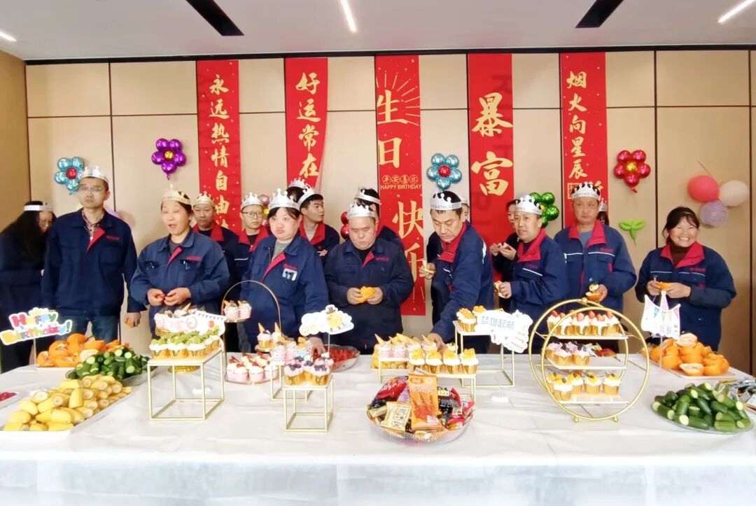 生日会上,公司精心准备精美的蛋糕、水果与专属惊喜,用美味慰藉味蕾,用祝福温暖人心,让寿星们在欢声笑语中共度难忘时刻,温情满满,兼具仪式感与幸福感。