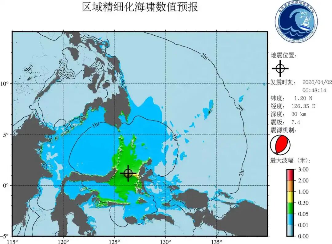 针对此次地震事件,自然资源部海啸预警中心在地震发生后立即启动应急响应机制,依托覆盖震源周边海域的海洋观测网络,对本次地震进行了快速分析研判,并分别于2日6时58分、8时16分(面向南中国海周边国家)发布英文海啸预警信息两期,分别于6时59分、7时20分和9时14分发布三期国内中文海啸信息。