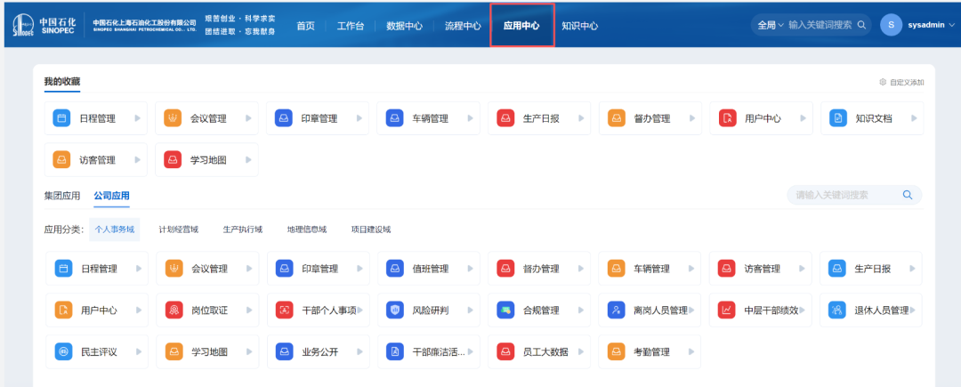 应用中心可实现集团应用与公司应用的统一认证、单点登录,部分集团应用待办信息可实时同步显示,打破系统壁垒。目前已快速构建日程、会议、值班、督办等8个轻应用,以及学习地图1个专业应用,形成覆盖核心办公场景的应用矩阵。同时,将综合协同办公平台13个应用统一归入个人事务域平台,实现业务应用资源的集约化治理。