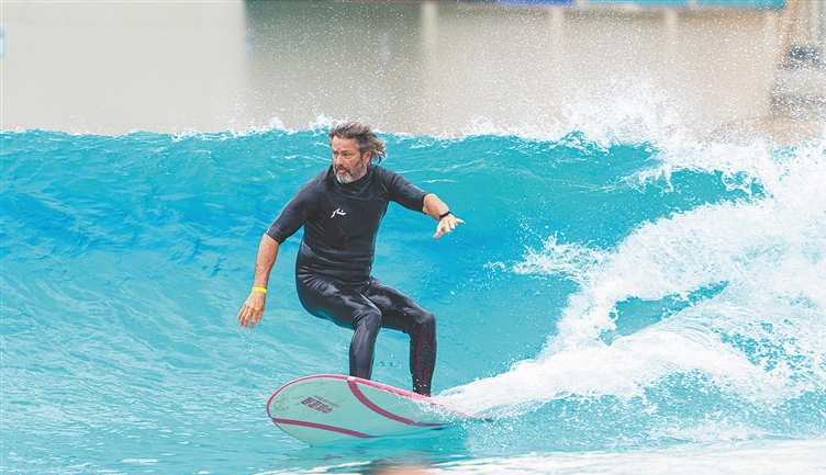 在万宁日月湾的中旅逐浪度假区,冲浪爱好者在人工造浪池里尽情享受冲浪乐趣。海南日报全媒体记者 袁琛 摄