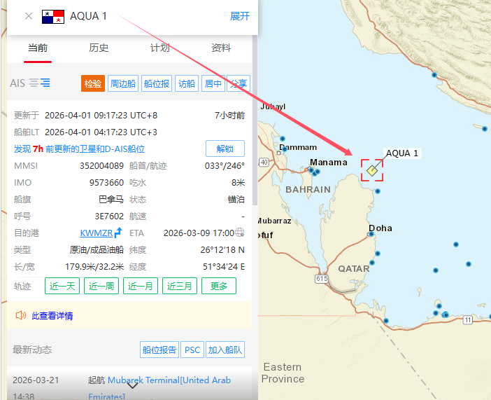 船舶为一艘约4.79万吨级油船,船名Aqua 1。船舶左舷水线上方被击中,随后船上起火。