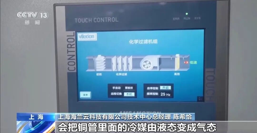 上海海兰云科技有限公司技术中心总经理 陈希恰:我们的背板空调将服务器产生的热空气抽过来,会把铜管里的冷媒由液态变成气态,就会通过它自身的浮力上升到上部组块的制冷层。在制冷层上与换热器通过海水进行热交换,由气态变成了液态。又通过重力的方式回到数据仓的机房当中,形成了无动力的热传递交换。