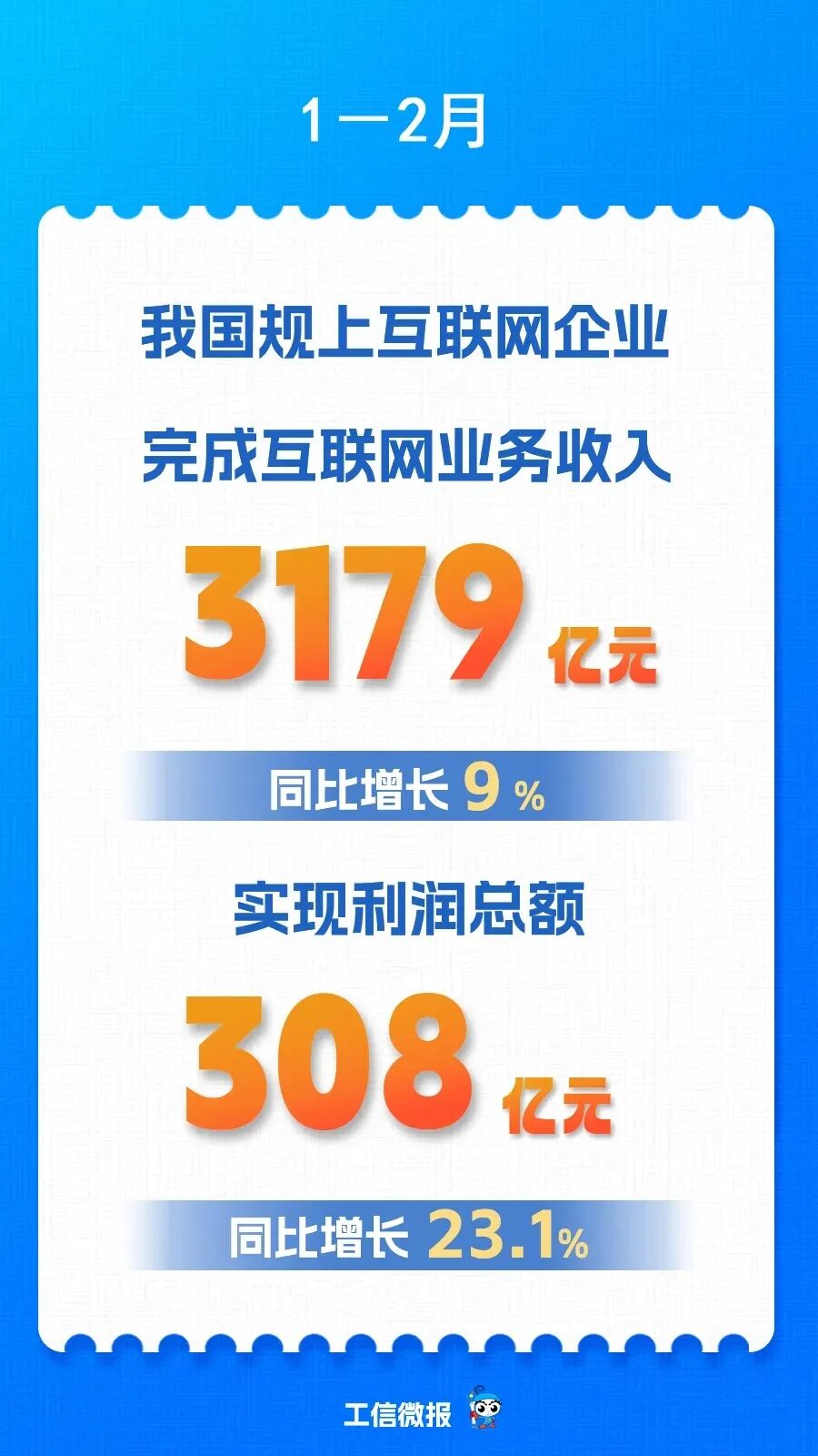 1—2月,我国规上互联网企业完成互联网业务收入3179亿元,同比增长9%;实现利润总额308亿元,同比增长23.1%;共投入研发经费167.2亿元,同比增长12.2%。