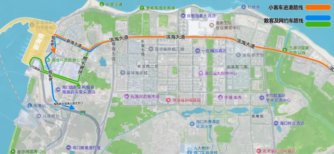 滨海大道 → 新海大道 → 海色路 → 新海港