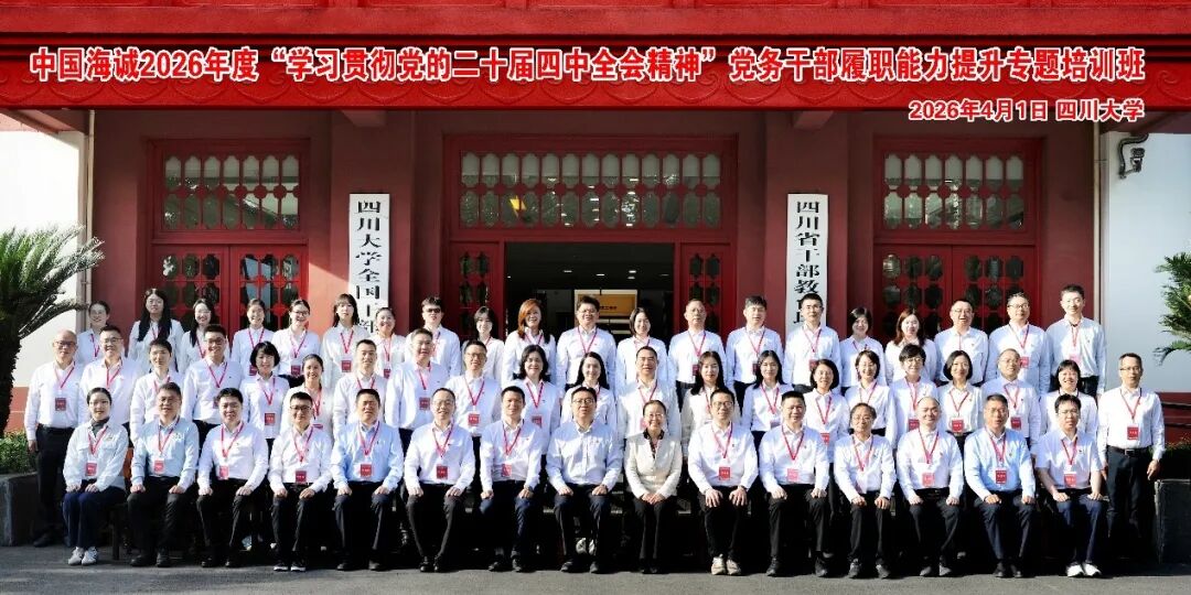 为进一步提升基层党务干部的政治素质和履职能力,深入学习贯彻党的二十届四中全会精神,4月1日至4月3日,中国海诚在四川大学全国干部教育培训基地举办2026年“学习贯彻党的二十届四中全会精神”党务干部履职能力提升培训班。中国海诚各级纪委书记、党群纪检部门负责人及工作人员、党支部书记等共计56名学员参加了集中培训。
