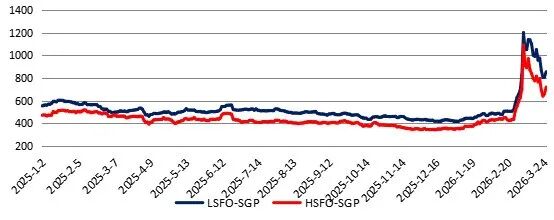 上周新加坡高硫380cst燃料油均价701.6美元/吨,较前一周均价下跌96.4美元/吨,0.5%低硫燃料油均价862.6美元/吨,较前一周均价下跌156.8美元/吨。