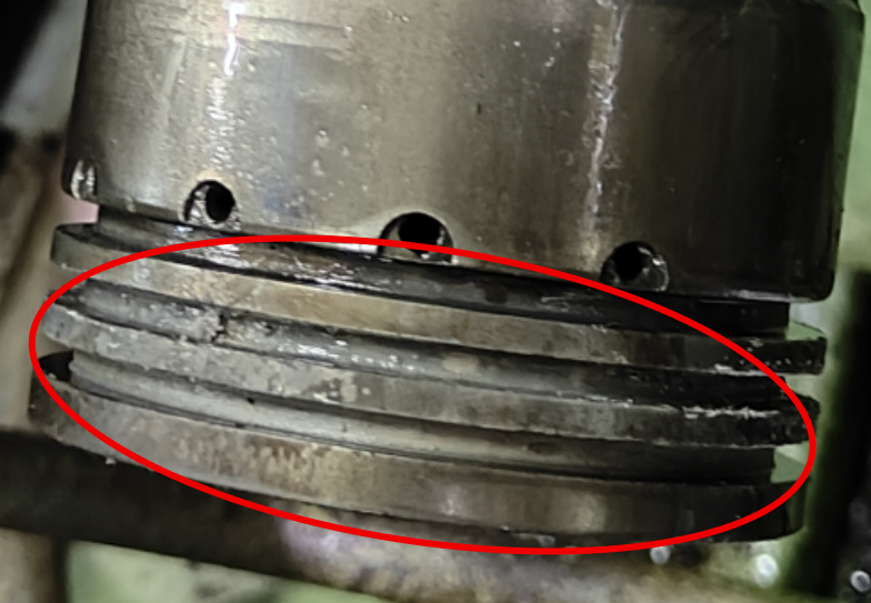 根据查阅到的相关信息,既然2级压力高,那我们分析原因应该还是处于3级,由于是风冷的空压机,不存在空冷器堵塞的问题,加上之前已经更换了3级的阀片,因此分析3级的活塞应该有问题。带着这些疑惑,我们拆解了3级活塞,发现3级的3道活塞环前两道由于水垢的原因已经卡住在环槽内。如下图所示前两道活塞环槽以及布满大量的水垢。