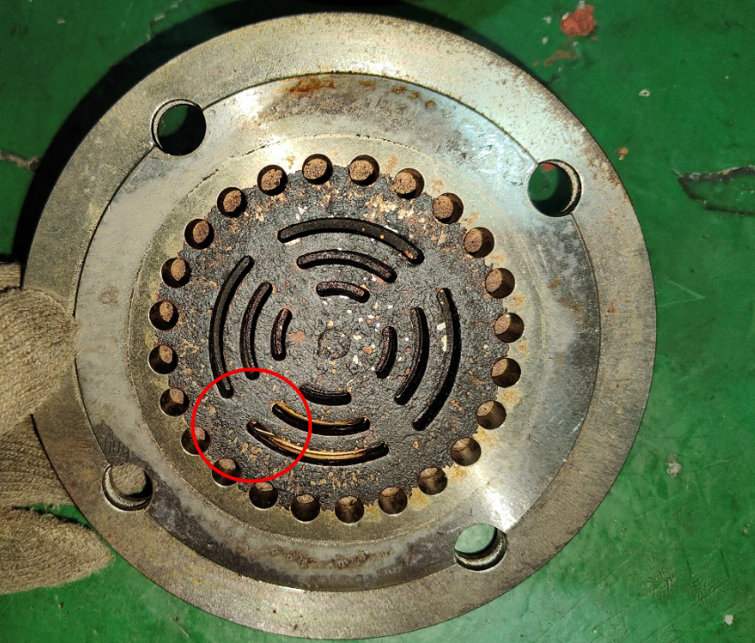 由于出现问题的是3级进,也就是2级排处的压力表,分析应该是3级的阀片密封不严造成的2级压力高。因此先把3级阀片拆出检查,发现该阀片确实有一处破掉了。如下图所示,以为原因找到了。换新3级阀片,装复测试,发现3级进的压力表倒是不波动了。但压力还是很高,有15-16bar,与2号空压机对比,此处压力应该为8-9bar。