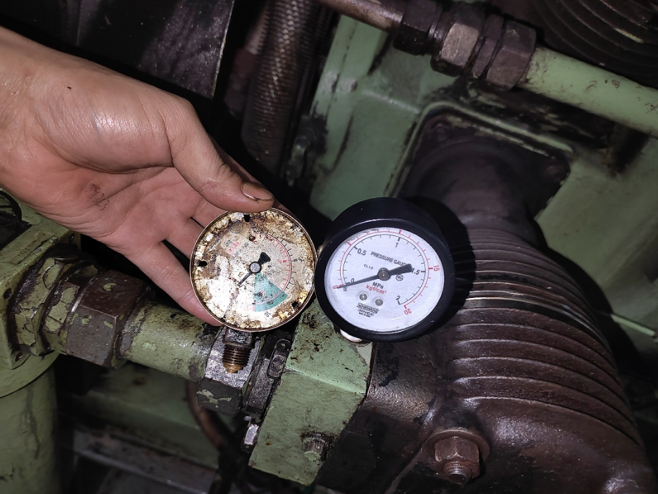 直到有一天,我们正忙着给空调压缩机加滑油,远远看到空压机那边冒烟了,过去一看,发现是喷到风冷片(上图的1,2级冷却片)上的滑油,由于高温高压的压缩气体将滑油几乎都要点着了。紧急停掉空压机,发现是3级进压力表爆l,滑油从压力表处喷出来溅到冷却片上造成的。当时也没有多想,还是以为压力表可能使用的时间太长了才坏掉的。直接换了个新的,但1号空压机(出问题的空压机)各级压力跟2号空压机运行时对比发现3级进口处的压力表不仅压力高,还波动很大,才决定第二天彻底解决空压机的问题。