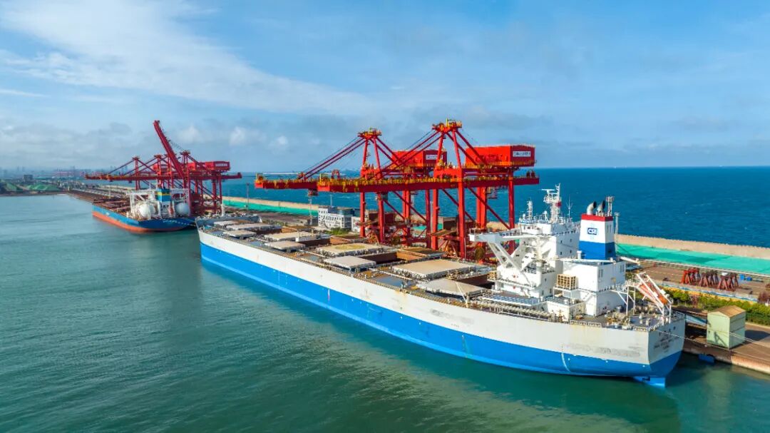 港口泊位上,40多米高的红色卸船机钢铁巨臂稳稳移动,从船舱里抓取大宗货物,精准地放在传送皮带上。