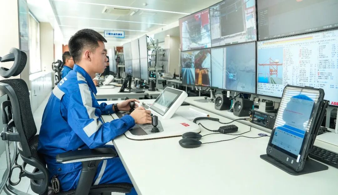 来到石臼港区南区智能运营中心集控室,电子大屏上数据闪烁,船舶动态、货物信息、作业进度等一目了然。操作人员在一排排屏幕前熟练地推拉手柄,遥控着远处那威风凛凛的卸船机。