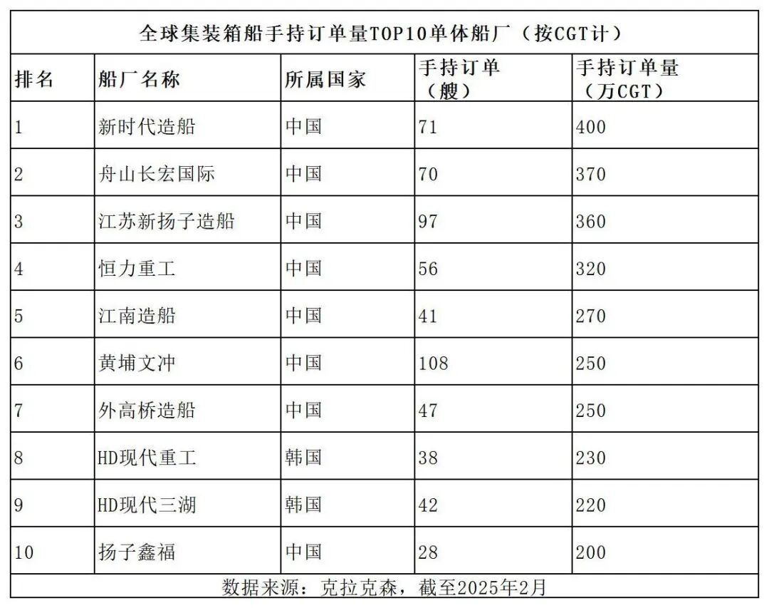 位于江苏靖江的新时代造船排名第一,手持订单71艘,合计400万CGT,订单排至2030年。
