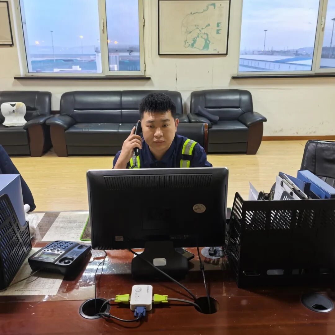 调度员也是现场的“移动安全哨”,每天要不停地在码头前沿、堆场、作业线之间巡查,紧盯装卸关键环节,随时解决设备故障、货物积压、衔接不畅等问题。“今日事今日毕”是我一直以来的工作准则,随身携带的对讲机常常微热,工装口袋里的记号笔也是常能派上用场,一步一印,一问一记,用脚步丈量安全半径,以响应速度定义责任职责。