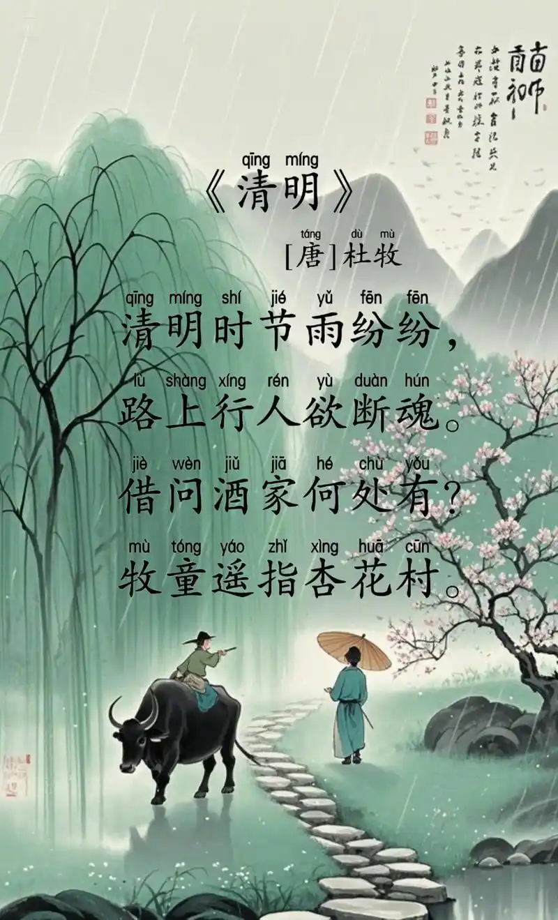 清明节在古代不仅是祭祖之日,也是踏青游乐的节日。这种悲喜交织的节日特质,使得诗中情感更具层次。杜牧以“雨纷纷”压抑了节日的欢愉,突出了孤独行人的落寞,使全诗从一开始就笼罩在一种淡淡的忧伤与诗意的沉思之中。
