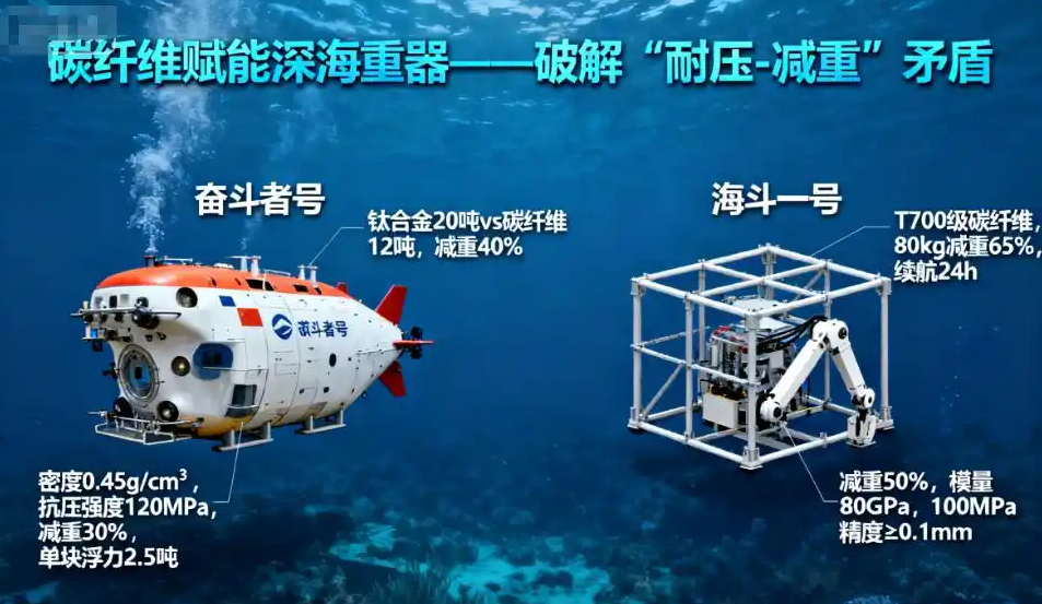 碳纤维复合材料可制造承受深海高压的耐压壳,传统玻璃微珠复合浮力材料密度≥0.6g/cm³,而碳纤维增强空心玻璃微珠复合材料(碳纤维体积含量15%-20%)密度可降至0.45g/cm³,抗压强度达120MPa。如中国研发的碳纤维无人潜航器(AUV/ROV)耐压壳体可安全下潜至6000米,极限达9000米,远超传统钛合金或钢制结构的重量限制,尽管碳纤维在深海应用中曾因“泰坦号”事故受质疑,但中国团队通过优化铺层设计、界面改性及壁厚控制(如3cm壳体承受77MPa压力),已突破传统认知瓶颈。“奋斗者号”万米载人潜水器的浮力块采用该材料,单块浮力达2.5吨,较传统材料减重30%,同时在10909米马里亚纳海沟下潜中,浮力块无变形、无渗漏,支撑潜水器实现30次万米下潜。