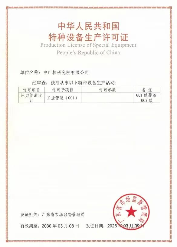 资质与能力建设取得新突破。中广核工程牵头研发的“CGN-71DR型汽轮机抗燃油泵”入选《中央企业科技创新成果推荐目录》;中广核研究院获得由广东省市场监督管理局颁发的压力管道设计(工业管道GC1)《中华人民共和国特种设备生产许可证》,标志着中广核研究院已具备非核级工业管道领域的最高级别设计资质;此外,中广核研究院获得国家核安全局正式颁发的《TC-24P乏燃料运输容器设计批准书》(国核安发〔2026〕54号),这是中广核首次获得乏燃料运输容器设计批准书,标志着集团在该领域取得重要突破。