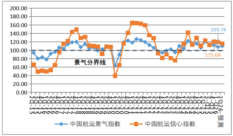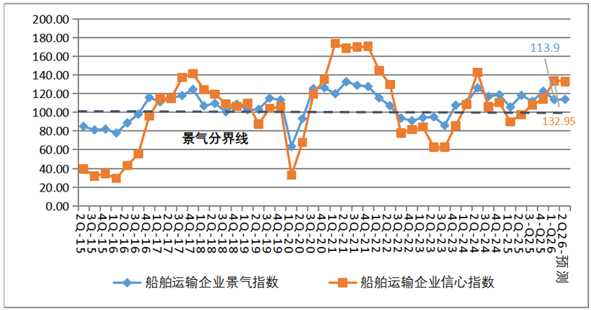 预计船舶运输企业经营指标基本向好。2026年第二季度,船舶运输企业景气指数预计为113.9点,较本季度上升0.27点,维持相对景气区间;船舶运输企业信心指数预计为132.95点,较本季度下降0.66点,维持较为景气区间。总体来看,预计2026年第二季度船舶运输企业经营状况持续向好,但企业家们对行业未来发展前景仍保持较强信心。集装箱运输企业的景气指数预计为108.78点,较本季度下降1.81点,降至微景气区间;集装箱运输企业的信心指数预计为82.22点,降至相对不景气区间。干散货运输企业景气指数预计为127.38点,较本季度上升8.48点,升至较为景气区间;干散货运输企业信心指数预计为174.75点,较本季度上升6.37点,维持较强景气区间。其中盈利情况景气指数112.58点,较本季度上升17.17点,进入相对景气区间。