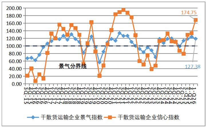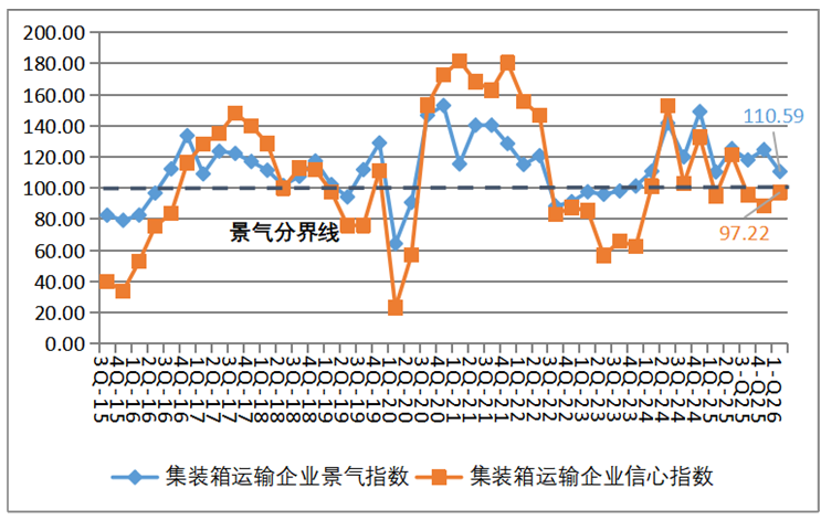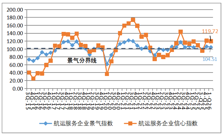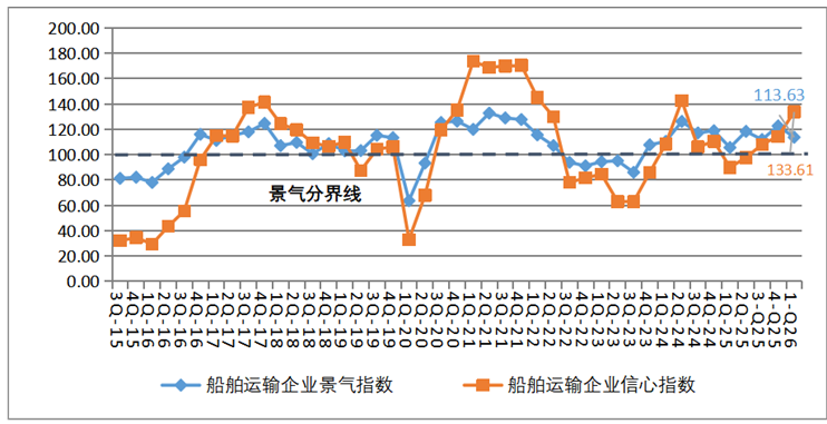 集装箱运输企业信心指数维持不景气区间。2026年第一季度,集装箱运输企业的景气指数为110.59点,较上季度下降了14.02点,降至相对景气区间;集装箱运输企业的信心指数为97.22点,较上季度上升8.65点,仍处于不景气区间。集装箱运输企业总体营运状况有所回落,企业家们对行业总体发展信心仍显不足,并且集装箱运输企业经营指标有所回落。从各项经营指标来看,集装箱运输企业运力投放继续增加,但舱位利用率下降,运费回落,企业营运成本上升,导致企业盈利情况大幅走弱。但企业流动资金仍较宽裕,融资难度依然降低,贷款负债有所减少,劳动力需求上升,使得企业家们对船舶运力投资仍保持一定意愿。总体上,虽部分经营效益指标有所走弱,但资金状况和融资条件仍较好,企业经营仍保持一定韧性。