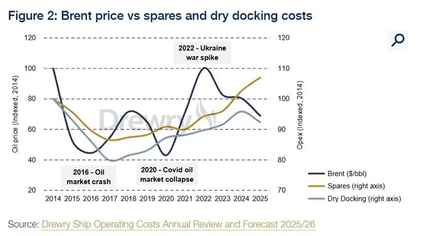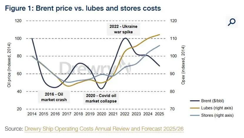 船舶机械及发动机部件的制造涉及高耗能工艺,如炼钢与精密加工,且通常伴随长途运输。因此,油价上扬将持续推高备件价格。不过,涉油运营成本并非随油价上涨即刻攀升,因船东通常依赖现有库存及长期供应协议。鉴于此,高油价对船舶整体运营成本(含各项技术成本)的冲击存在一定的滞后性。