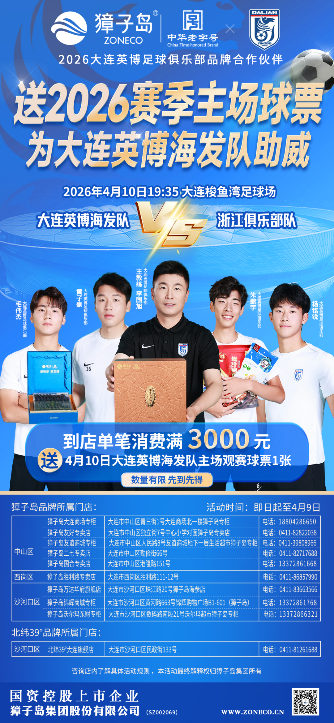 为答谢广大球迷与消费者的厚爱,獐子岛集团现推出大连英博海发队主场单场球票赠送活动,让更多球迷可以亲临赛场,感受这座城市的足球热情,助力大连英博海发队新赛季取得骄人成绩。