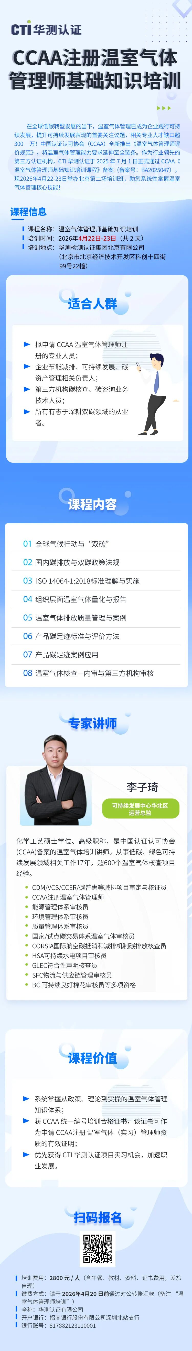 同时,CTI华测认证 2025 年 7 月 1 日正式通过 CCAA《温室气体管理师基础知识培训课程》备案(备案号:BA2025047),获CCAA授权开展注册温室气体管理师培训。已成功于北京、上海、深圳、昆明、成都、郑州、长沙等地开办多场专业培训,获参训学员认可。现定于2026年4月22日-23日举办北京场培训班,助您系统性掌握温室气体管理核心技能!
