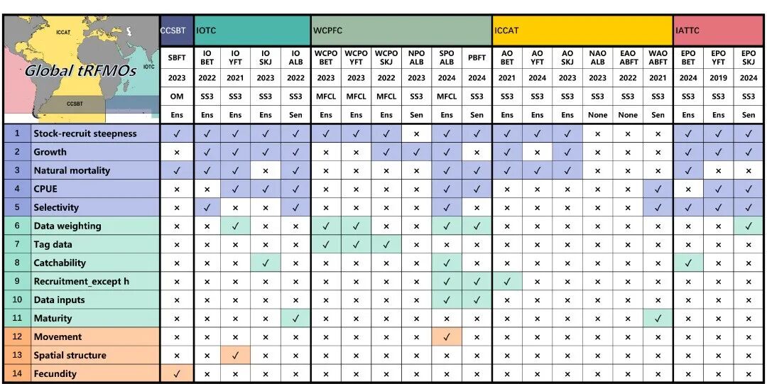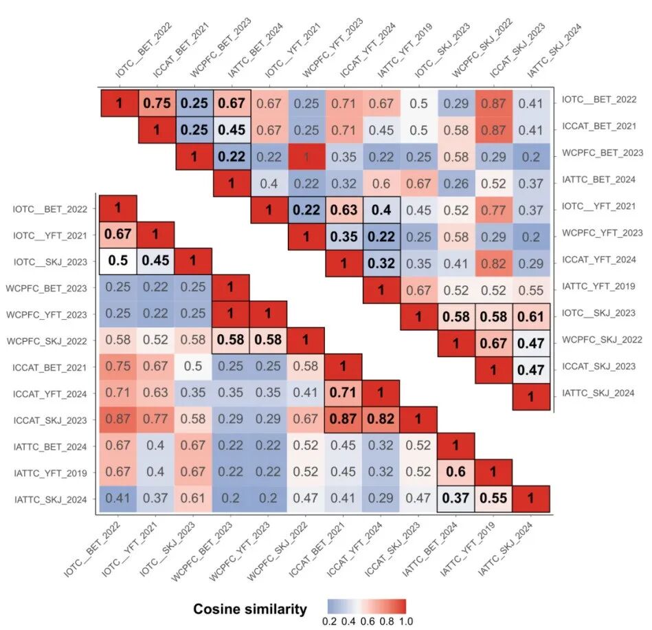 金枪鱼是全球最重要的海洋渔业资源之一,其可持续开发依赖科学的资源评估。然而,不同的区域渔业管理组织在评估金枪鱼时,采用的模型假设和不确定性设置存在明显差异。研究团队通过梳理过去二十余年的100余份金枪鱼评估报告,分析了五大区域渔业管理组织中的七种主要金枪鱼的评估数据,首次系统量化了评估模型不确定规范的差异及其主观性在评估中的影响,为国际渔业管理提供了新的科学依据。