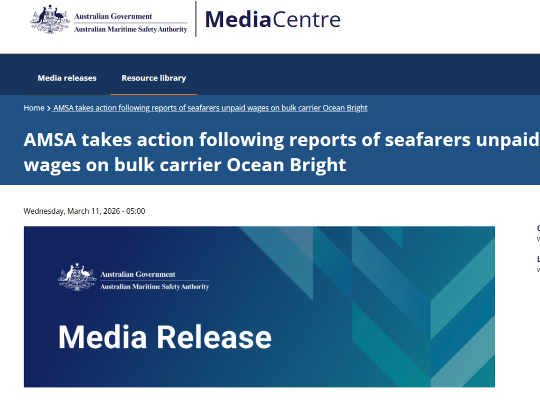 如上截图显示,根据 AMSA 官方“拒绝进入名单”页面显示,Ocean Bright的拒绝进入决定签发日期为2026年3月8日,处罚期限为180天,到期日为2026年9月4日。Refused access for:180 daysExpiry date:4 September 2026Reason:Systemic underpayment of wages这里尤其值得注意的是“systemic”这个词。它并不是简单地说“发生了工资拖欠”,而是强调拖欠具有系统性、持续性、结构性特征。这类措辞通常意味着,监管机构认为问题并非单个工资周期的偶发差错,而是与船东、管理体系或船上执行机制存在更深层次的失灵有关。也正因此,AMSA 采用的不是一般整改,而是直接将该轮列入正式禁港名单。AMSA释放强烈信号:船员权益问题上“零容忍”