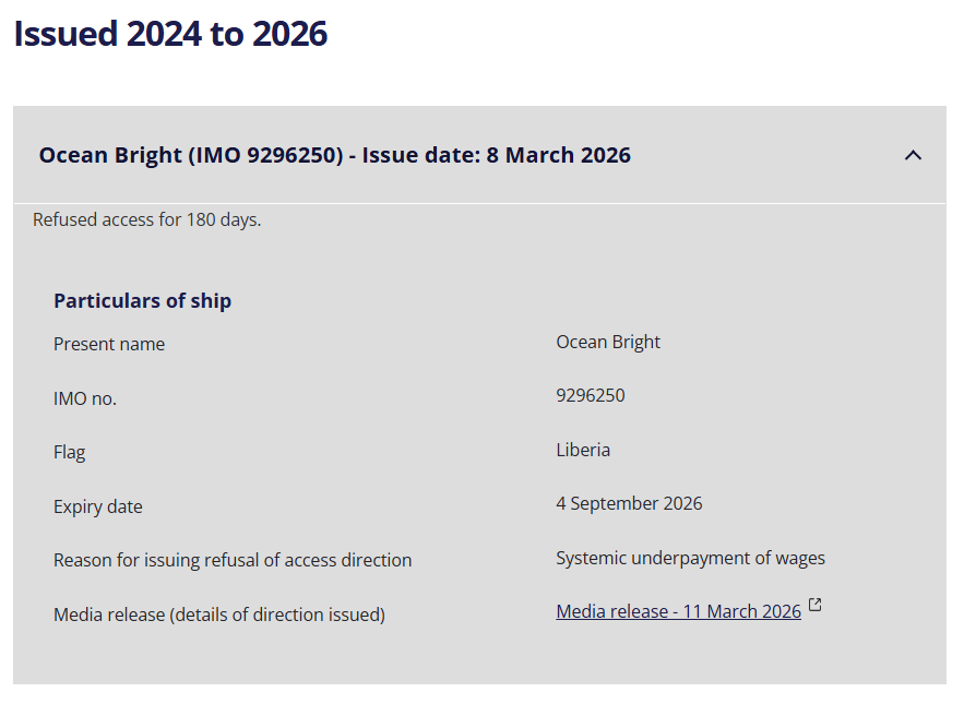 值得注意的是,这次事件并不只是“拖欠工资”这么简单。AMSA 在登轮检查中还发现,Ocean Bright另存在多项问题。根据官方通稿,AMSA 在此次检查中一共识别出18项缺陷(deficiencies),其中有4项属于可导致扣船的严重缺陷(detainable deficiencies)。也就是说,即便不考虑工资拖欠因素,这艘船在合规和船舶管理方面本身也已经暴露出不小的问题。AMSA 的处理路径也体现出较强的程序性:先是基于检查结果对该轮实施扣留,待缺陷完成整改后,才允许船舶离开;但离开并不意味着处罚结束。恰恰相反,在整改放行之后,AMSA 又进一步下达拒绝进入指令,明确要求该轮在2026年9月4日之前不得进入澳大利亚水域。这一点说明,澳方并未将此事作为一次普通 PSC 缺陷整改事件处理,而是将其上升到对船员权益系统性侵害的执法层级。处罚落地:3月8日签发禁令,180天内不得靠泊澳港