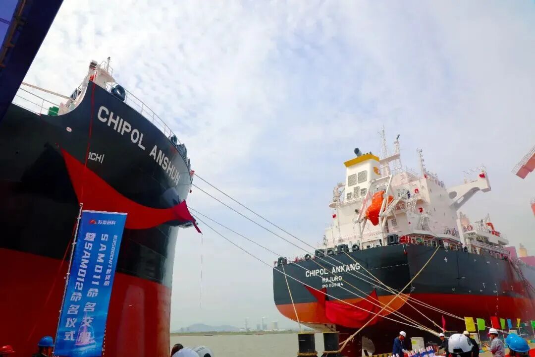 4月8日,江苏苏豪船厂为中波公司建造的2艘63500载重吨散货新船“中波安顺(CHIPOL ANSHUN)”、“中波安康(CHIPOL ANKANG)”轮分别交付和命名。