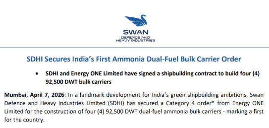 4月7日,印度船企天鹅防务重工(Swan Defence and Heavy Industries)宣布,该船企已与Energy ONE签订4艘92500载重吨氨双燃料散货船建造合同。该合同总价值在150.1亿卢比至300亿卢比(约1.6亿至3.2亿美元)。首制船预计将于2029年10月交付。