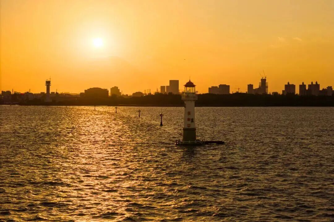 傍晚时分,夕阳洒在江面,金波荡漾,可以拍到绝美的江景日落。