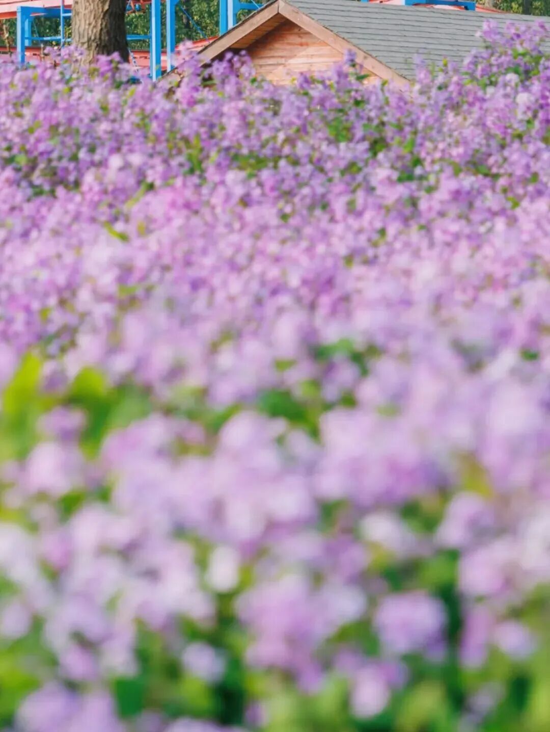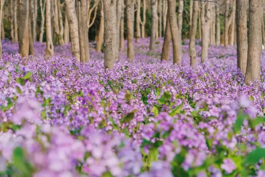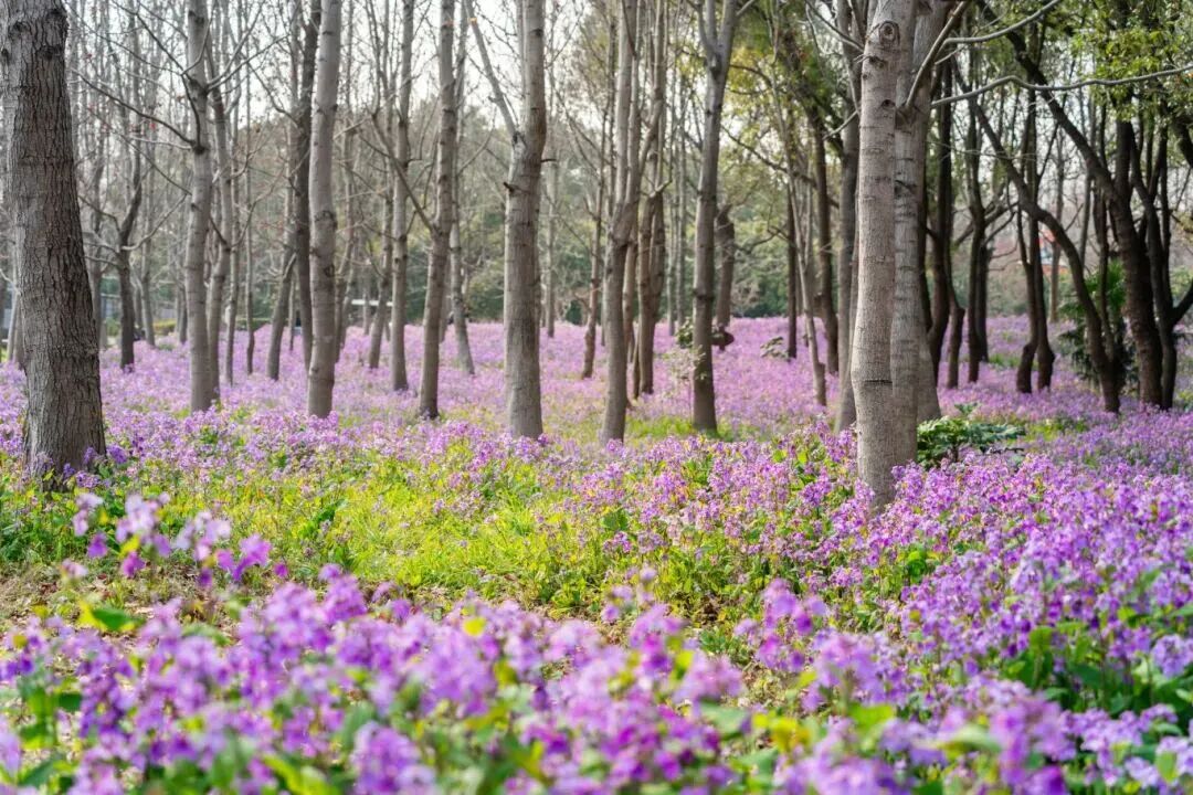 园内水杉林下、步道旁,大片二月兰肆意绽放,铺展成蓝紫色花海,阳光透过枝叶洒下,光斑落在花间,宛如走进童话森林。