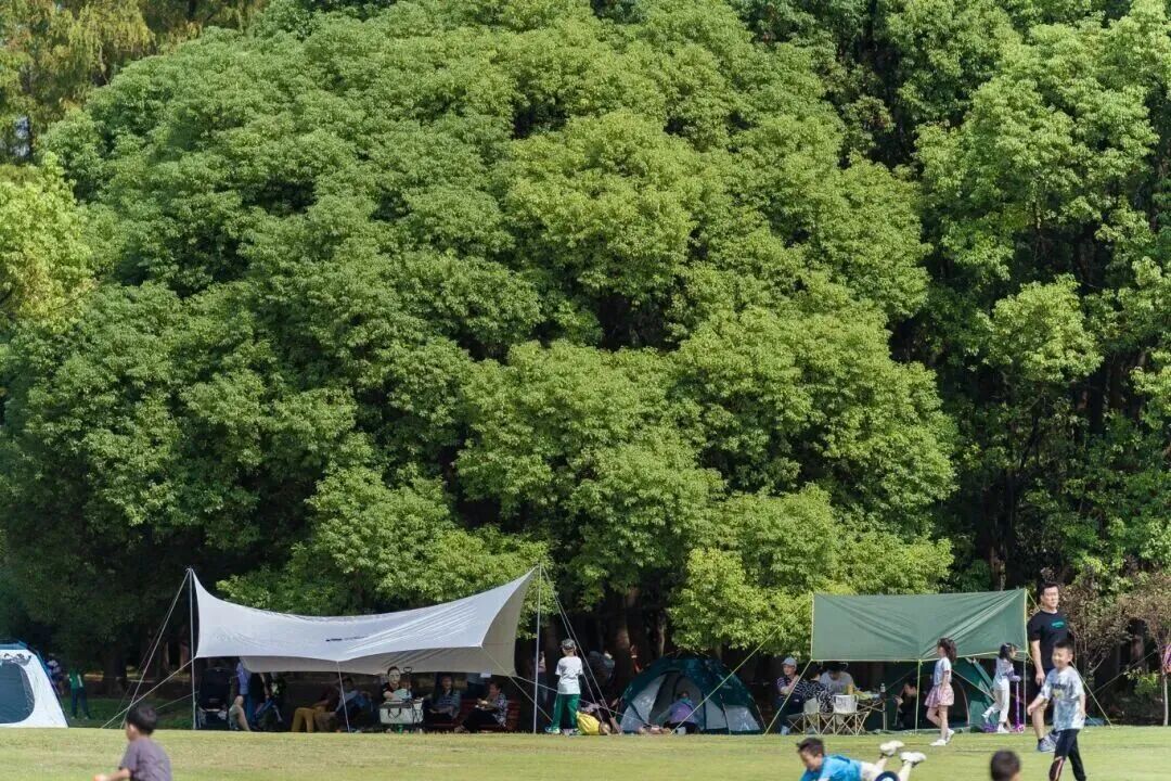 除了花海旁可以露营,被森林环抱的草地视野更开阔,支起天幕、铺开野餐垫,便拥有了一方独属于自己的春日小天地。