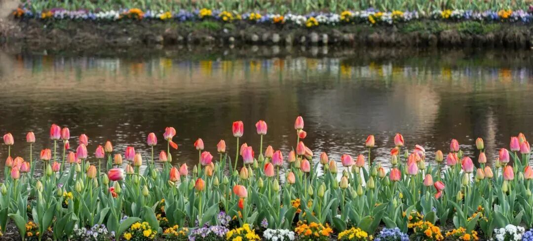 多果路上大面积种植的郁金香,如同大自然打翻的调色盘,将这里装点得生机盎然,色彩交融,如精心铺就的艺术品,美得如梦似幻。微风拂过,花影与水波相映,随手一拍都是法式浪漫大片。