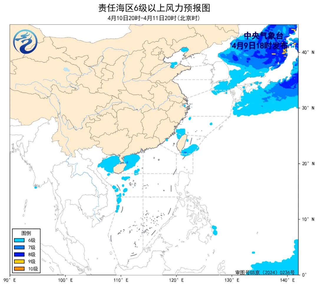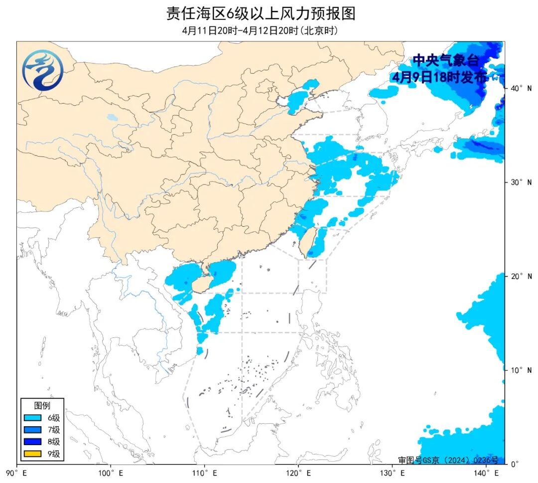 预计,4月12日夜间至16日白天,渤海、巴士海峡、北部湾、南海西北部海域、南海东北部海域、南海中西部海域、南海西南部海域将有5~6级、阵风7级的风,黄海大部海域、东海大部海域、台湾海峡、台湾以东洋面将有6~7级、阵风8级的风。
