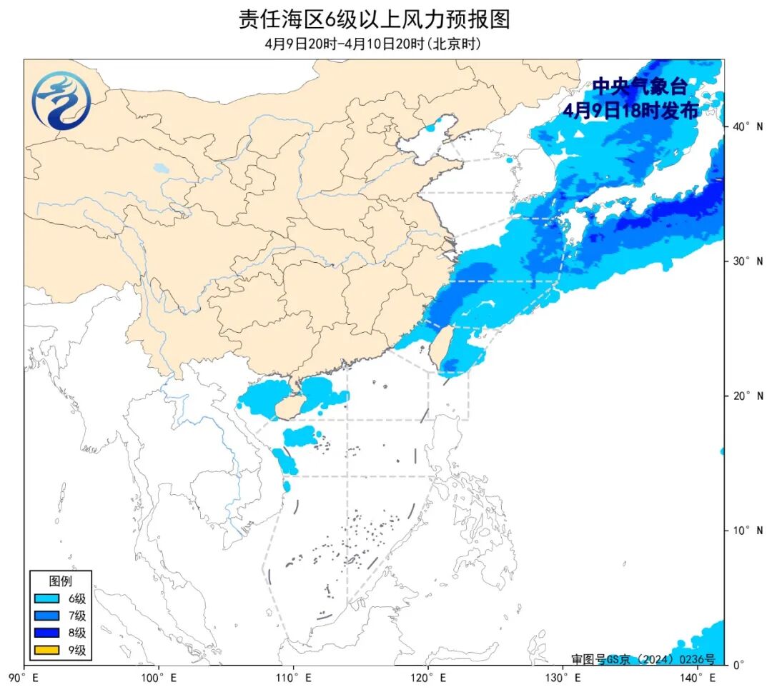4月9日02时至14时,黄海中部和南部海域、东海大部海域、南海西北部海域、北部湾出现了5~7级、阵风8级的偏南风。