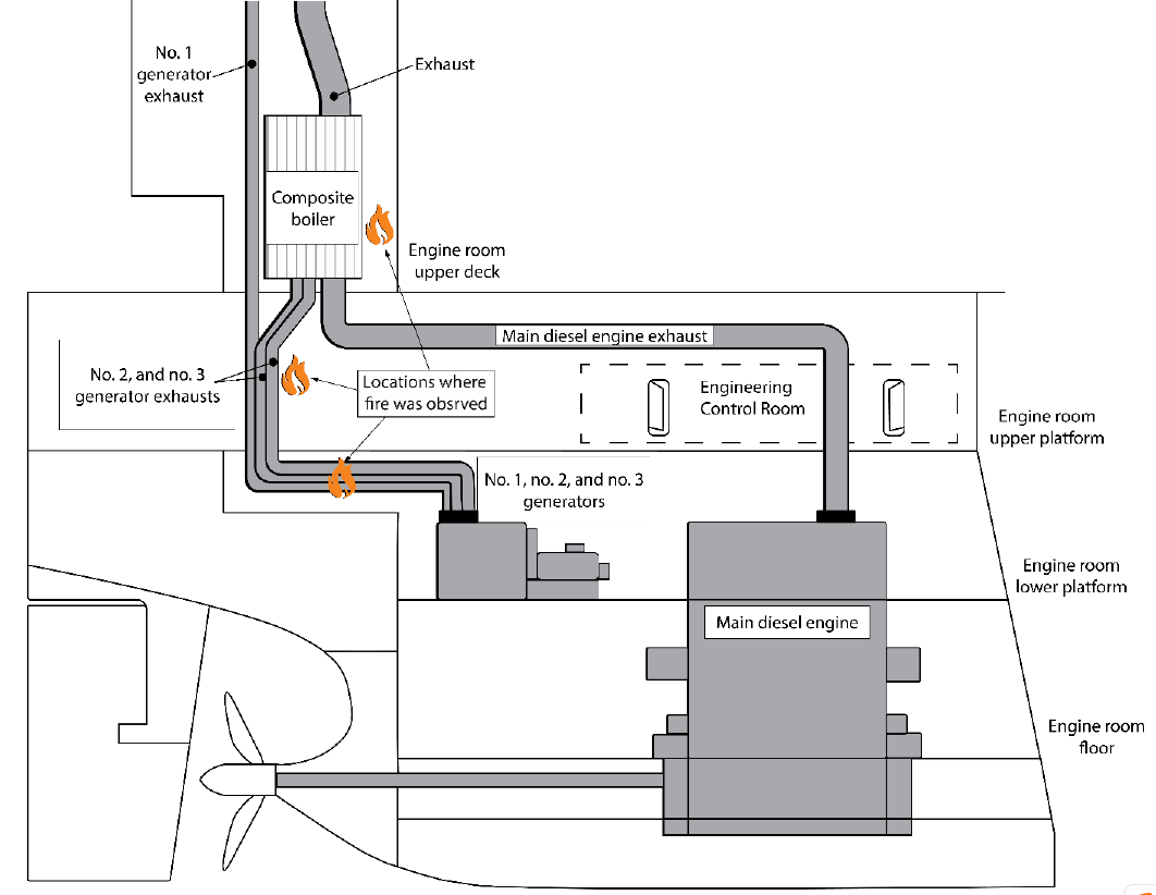 •2025年1月5日凌晨,现场确认火灾已完全扑灭。当日上午,轮机长穿戴自给式呼吸器进入机舱,经气体检测仪检测确认舱内环境安全后,启动1号发电机(其排气未接入锅炉系统),结合现场勘查情况,初步判定火灾起火点位于锅炉燃烧器的燃油流量计附近。