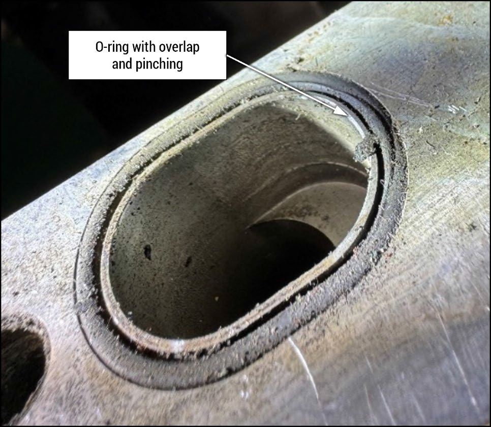 经勘查确认,该接口存在径向对中偏差,导致部分O型密封圈边缘重叠进入燃油端口,并被上下模块挤压;挤压后的密封圈无法平整贴合接口,密封性能大幅下降,形成潜在燃油泄漏隐患。且该接口间隙在模块螺栓紧固后,无法通过常规视觉检查发现,导致隐患长期未被排查。