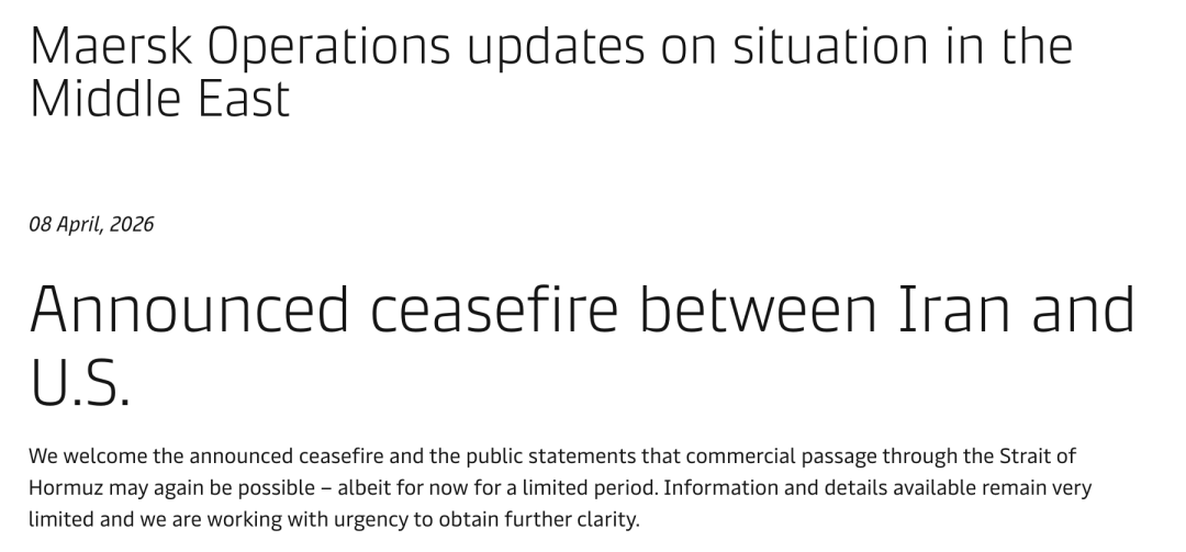马士基4月8日发布中东局势运营更新,强调当前可获取的信息与细节仍十分有限,该公司正紧急推进工作以进一步厘清当地情况。